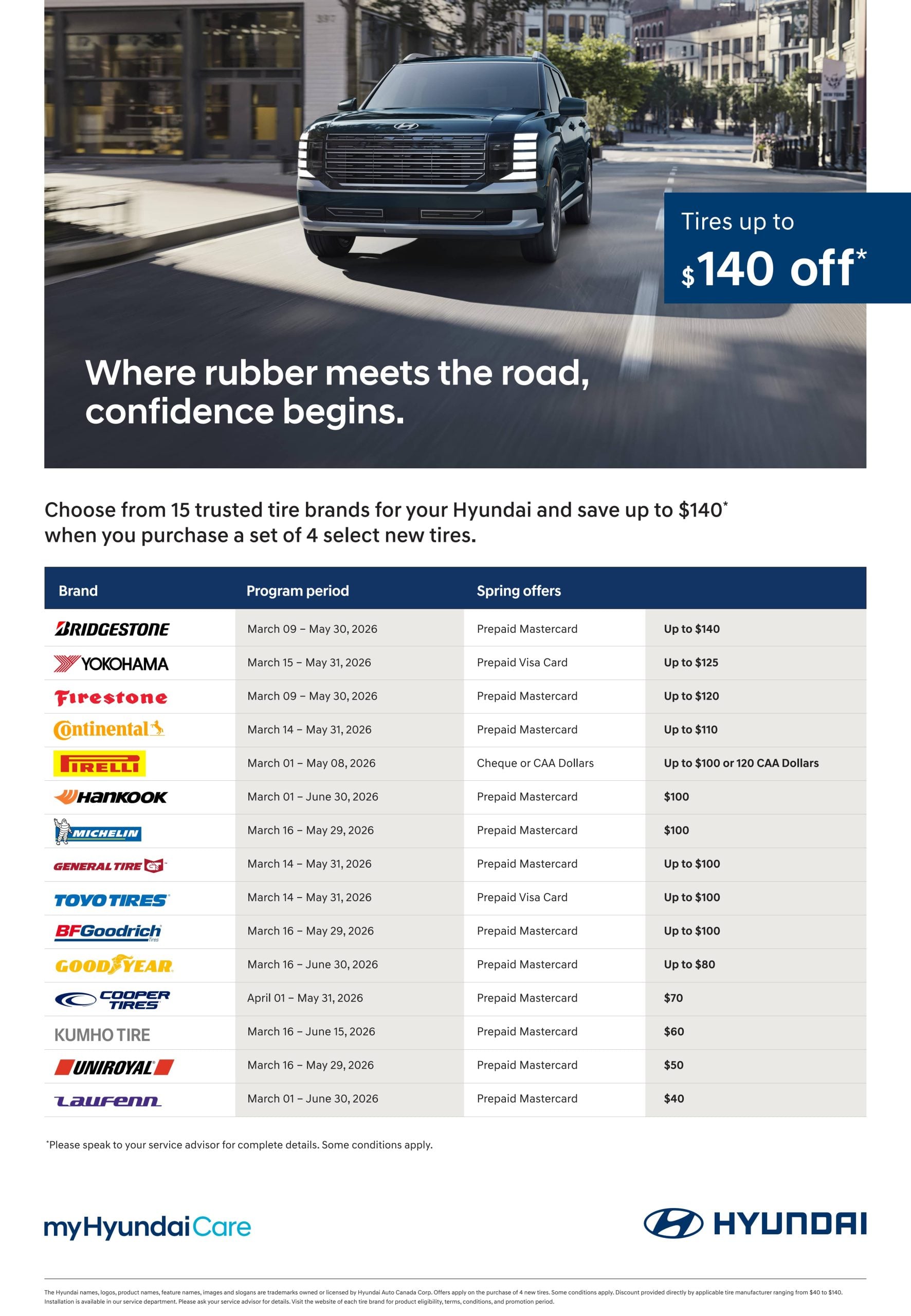 We partner with top tire brands to offer you exceptional quality and service. Periodically, tire manufacturers offer promotional rebates to provide even greater value. Rebates can be redeemed by submitting a claim online or by mail after you purchase and install qualifying tires at Jim Pattison Hyundai Surrey.